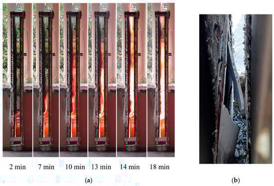 The key stages of the experiment are illustrated in Figure 2a. Flames briefly entered the intermodular cavity at approximately 2 min (120 s) after ignition. By 7 min (420 s), the flame ingress into the cavity became more consistent. Around 10 min (600 s) into the experiment, flames within the cavity extended to its upper regions, indicating intensified flame spread. Between 10 min (600 s) and 13 min (780 s), visible cracks appeared on the plasterboard above the opening (Figure 2b), attributed to direct exposure to flames. By 14.45 min (895 s), flames were observed to exceed the top of the cavity, accompanied by signs of plasterboard detachment within the fire compartment. The experiment concluded at 18 min (1100 s) due to the significant degradation of the plasterboard in the fire compartment.