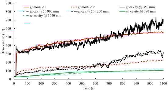 The temporal variation in gas (gt) and surface (wt) temperatures recorded during the test is presented in Figure 3. Gas temperatures within the fire compartment and the adjacent compartment gradually increased, reaching 555 °C and 225 °C, respectively. Within the intermodular cavity, the maximum gas temperature was 732 °C at a height of 350 mm, while the maximum temperatures at 900 mm and 1200 mm heights were approximately 300 °C. The temporal profiles of gas temperatures at 900 mm and 1200 mm heights exhibited similar trends, attributable to the relatively small vertical separation between these thermocouple positions.