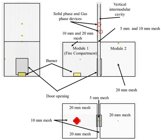 Based on Livkiss et al.’s [] recommendation of a mesh size approximating one-tenth of the cavity width, a uniform cell size of 5 mm (aspect ratio = 1) was adopted for the central cavity portion. A coarser uniform cell size of 10 mm was applied to the remainder of the cavity. The fire compartment utilized a 10 mm mesh near the door opening and a 20 mm mesh elsewhere, while the second module was modelled with a uniform 20 mm mesh size.