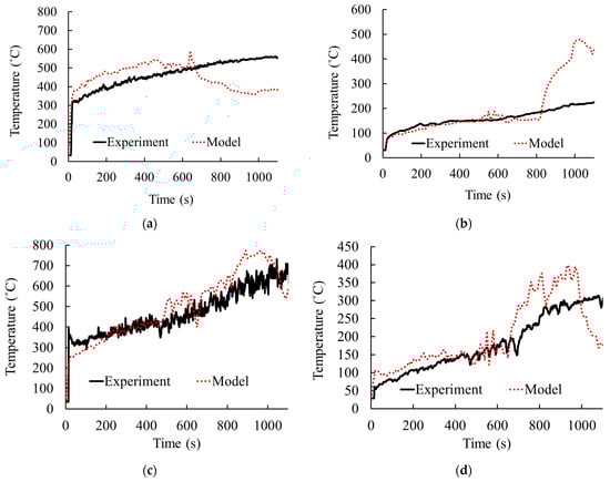 The geometry of the numerical model developed to simulate the experiment is illustrated in Figure 4. The domain was sized at 1.29 m × 0.64 m × 1.28 m to match the setup’s dimensions. Solid obstruction elements were used to model the walls, floors, ceilings (thin element), and the gas burner. To enable heat transfer, these walls, floors, and ceilings were modelled with a “layered” surface type with “exposed” backing [,]. The combustion of gas species emitted by the burner was simulated using the complex stoichiometry approach []. The thermal behavior of materials was incorporated using temperature-dependent material properties, including conductivity, specific heat capacity data, and emissivity data, sourced from the literature [], along with a material density of 850 kg/m3. All numerical domain boundaries, except the bottom, were left open to ambient environmental conditions. Gas and wall temperatures at corresponding positions in the experiment were determined using gas-phase and solid-phase temperature measuring devices.