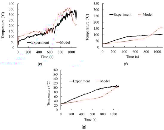 Comparison of gas temperature (gt) and wall temperature (wt) variations between the experiment and numerical model: (a) gt fire compartment; (b) gt adjacent compartment; (c) gt cavity at 350 mm; (d) gt cavity at 900 mm; (e) gt cavity at 1200 mm; (f) wt cavity at 780 mm; (g) wt cavity at 1040 mm.
