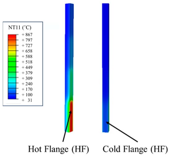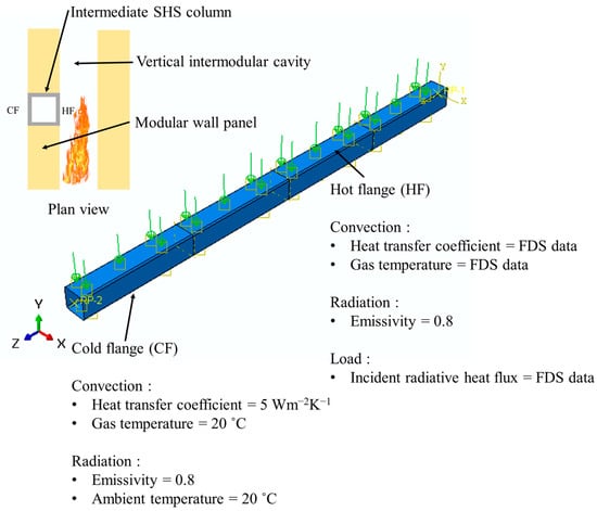 Depending on the analysis type, different boundary conditions were enforced. In the heat transfer analysis, the heat transfer into the column at the fireside (hot flange) and the heat dissipation at the unexposed side (cold flange) were defined using data obtained from the FDS simulation (Section 2.3.1). The data were taken at 750 mm intervals, and the averaged data were assigned to the column’s four regions (750 mm length segments). Figure 6 illustrates the assignment of boundary conditions. The incident radiative heat flux data, gas temperature, and heat transfer coefficients obtained from the FDS simulation defined the radiative and convective heat transfer on the hot flange. Conservatively, the heat transfer of the cold flange, exposed to the modular compartment (non-fire compartment above the fire compartment), was modelled with an ambient temperature of 20 °C, an emissivity of 0.8, and a heat transfer coefficient of 5 Wm−2K−1 []. The other two sides were considered insulated surfaces due to the usage of non-load-bearing panels.