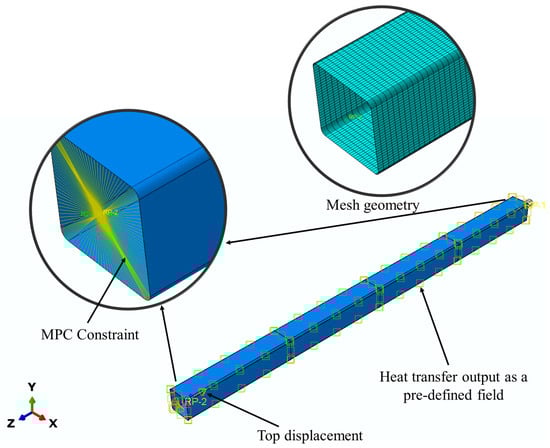 For the mesh of the model, a global mesh size of 5 mm × 10 mm, with refinement up to 2 mm × 10 mm at the curved edges, was considered based on the sensitivity analysis conducted by Balarupan []. The four-node heat transfer quadrilateral shell (DS4) elements were used to define the element behavior in the heat transfer analysis. Similarly, the four-node doubly curved thin or shell S4R elements [] were used in the buckling and nonlinear static analyses.