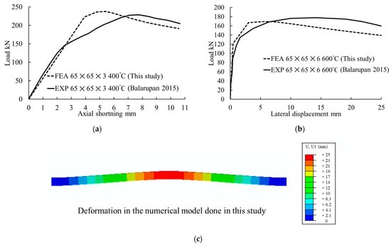 Comparison of the results of the numerical model with the experimental results of Balarupan []: (a) load vs. axial shortening of a 65 × 65 × 3 section at 400 °C; (b) load vs. lateral deflection of a 65 × 65 × 6 section at 600 °C; and (c) failure mode of 65 × 65 × 3 section at 600 °C.