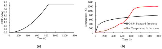 Design fire curve used for the fire simulation: (a) heat release rate of the fire source; (b) gas temperature at the mid-height of the fire compartment.