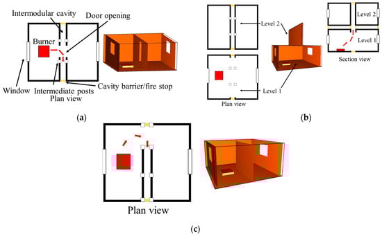 Modular buildings constructed by assembling prefabricated volumetric units (modular units) have become a sustainable solution [,] for the escalating demand for human settlement. These modular buildings often use cold-formed steel hollow members for the structural system (Figure A1 in Appendix A), including corner or intermediate columns, beams, and intermodular connections [,]. Despite these buildings’ structural and sustainability performance, their fire performance has certain uncertainties. Recent fires [,] have shown that intermodular cavities (Figure A2 in Appendix A), which accommodate structural connections, service lines, and assembly tolerances, can allow fire and smoke to spread. Therefore, these cavities must be sealed with fire stops and cavity barriers []. However, limited inspection accessibility, poor workmanship, and alignment issues [] can undermine their effectiveness, leading to fire ingress to intermodular cavities (Figure A3 in Appendix A).