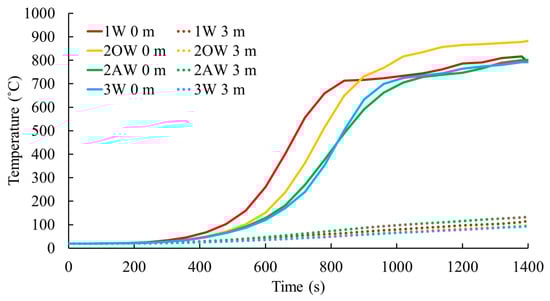 During the fire test, under negligible wind conditions, an ambient temperature of 28.75 °C, relative humidity of 83%, and an atmospheric pressure of 1.008 × 105 Pa were measured. The fire source’s heat release rate (HRR) was determined using gas flow measurements obtained from a diaphragm gas flow meter and a pressure gauge adjusted for the observed ambient pressure and temperature. In this calculation, the heats of combustion for propane and butane were considered as 46.3 MJ/kg and 45.7 MJ/kg, respectively []. Based on these parameters, the calculated heat release rate of the fire source was determined to be 16 kW.