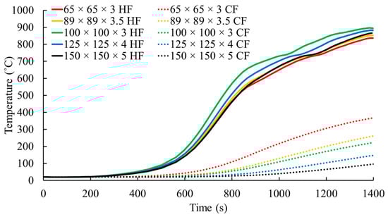 The temperature of the HF was influenced by the ratio of the fire-exposed face width to its thickness (w/t). For the column with the most significant w/t ratio of 33.3 (100 × 100 × 3 section), the HF temperature reached 896 °C at the end of the 1400 s fire scenario. The column with the lowest w/t ratio of 21.7 (65 × 65 × 3 section) resulted in an HF temperature of 837 °C. This 53% increase in the w/t ratio led to a 7% increase in the HF temperature. Moreover, on average, a 1% increase in w/t ratio can increase HF temperature from 0.08% to 0.46%.