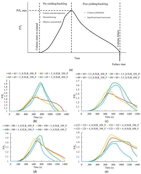 To investigate the structural response of SHS columns under cavity fire conditions, the variation in the relative restraining force (P/) throughout the fire scenario (Figure 15) is discussed in this section. The relative restraining force (P/) can be defined as the ratio of the column axial force to the initial axial force. Figure 15a illustrates the typical relative restraining force (P/) variation over time observed in this study. Accordingly, two distinct phases of structural response to the fire scenario can be identified. Similar phases have been reported in other research that examined the restrained thermal expansion of steel columns with uniform temperature distribution [,] as well as temperature gradient across the hot rolled steel section (uniform temperature along the length) [].