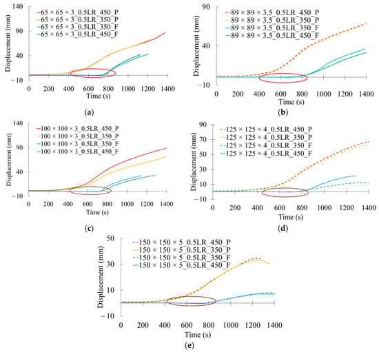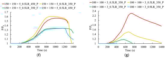 Relative restraining forces (P/) vs. time plots: (a) typical relative restraining force (P/) variation over time; (b) 65 × 65 × 3; (c) 89 × 89 × 3.5; (d) 100 × 100 × 3; (e) 125 × 125 × 4; (f) 150 × 150 × 5; (g) effect of load ratio (LR = load ratio, P = pinned, F = fixed, 0.5LR_450_P = pinned column with G450 steel grade under a 0.5 initial load ratio).