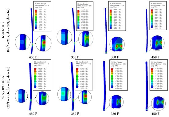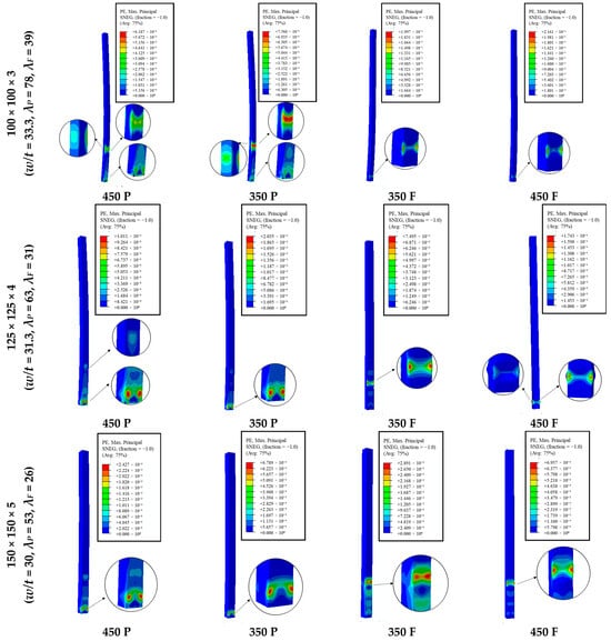 In the second phase, the column undergoes significant lateral deformation under the yielding and buckling until it reaches equilibrium. To maintain stability, as the lateral deflection increases, the bending moment increases. A conservative criterion for column failure is defined when the relative restraint force (P/) drops to 1.0, as suggested in prior studies [,].