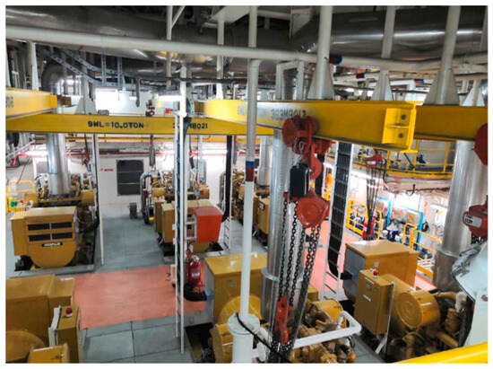The ship’s engine room, also referred to as the machinery space, is responsible for providing power and energy to the vessel. This area houses a variety of mechanical equipment and systems, including engines, boilers, fuel systems, exhaust systems, lubrication systems, cooling systems, and fire and safety equipment. The engine room structure of certain ships is highly complex, featuring multiple decks, densely arranged pipelines, and advanced automated control systems. Considering the resolution, computational capacity, and modeling efficiency of FLACS, the geometric model of the LNG ship engine room is appropriately simplified. Specific appearance details and materials of the engine room equipment are streamlined, retaining only the primary contours and essential materials. Additionally, small-volume equipment and components with negligible impact on LNG leakage and explosion are omitted [30]. The lower left corner of the ship’s engine room is designated as the origin of the modeling reference coordinate system, with the X, Y, and Z axes aligned with the length, width, and height of the engine room, respectively. Based on relevant specifications and engine room data, a 20 m long, 18 m wide, and 8 m high engine room model is constructed. Geometric models of ship equipment, including oil tanks, air bottles, oil–water separators, engines, sewage treatment devices, and gas pipelines, are sequentially established within the engine room. The real physical model of the ship’s engine room is shown in Figure 1. The simplified physical model of the ship’s engine room is illustrated in Figure 2.