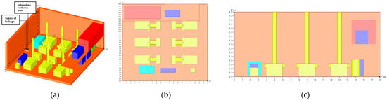 Cabin pictures: (a) is the 3D geometric model; (b) is a top view; (c) is a front view [30].