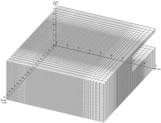 Because the simulation is limited by the computing power of the computer, the simulation time will be extended with the gradual densification of the grid division, and the accuracy of the simulation will be distorted with the gradual sparseness of the grid division, which requires that the grid division not only meet the research needs, but also meet the computing power of the computer. Based on the principle that grid density affects recognition accuracy, the region spanning 5 m to 15 m on the X-axis, 4 m to 14 m on the Y-axis, and 0 m to 8 m on the Z-axis is divided into a grid with a resolution of 0.2 m to meet obstacle recognition requirements. The remaining areas are adaptively meshed by the software. Additionally, due to the significant discrepancy between the grid density of the adaptive mesh at the leakage point and the scale of the leakage point, the accuracy of LNG dispersion and leakage simulation may be compromised [31]. Therefore, the grid at the leakage point is refined, and the transition between the refined and unrefined regions is smoothed to ensure that the thickness difference between adjacent control volumes does not exceed 40%. This enhances the accuracy and realism of the simulation results. After multiple iterations of grid refinement, balancing computational accuracy and efficiency, the total number of grids is 218,400. The final grid configuration is illustrated in Figure 3, and detailed grid information is provided in Table 2.