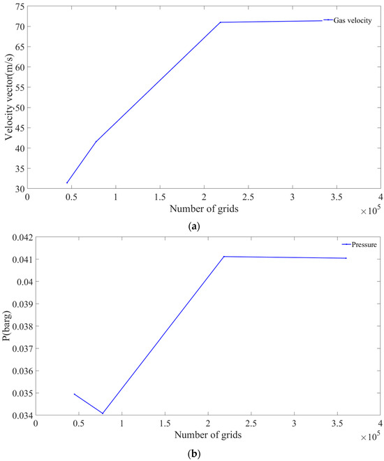 The relationship between parameters near the leak source and the number of grids: (a) is the relationship between gas flow rate and the number of grids; (b) is the relationship between pressure and the number of grids.