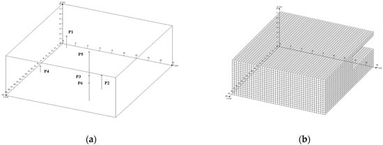 Using the FLACS gas cloud dump module, the LNG vapor cloud under leakage conditions at different time intervals is imported into the explosion model. Spatial distribution diagrams of pressure, maximum overpressure, temperature, and mass fraction of combustion products from the LNG explosion are generated using the P, PMAX, T, and PROD parameters in the 3D output module. Six monitoring points are established within the cabin to track pressure and temperature changes before and after the explosion. The coordinates of the six monitoring points are P1 (1, 1, 2), P2 (10, 10, 3), P3 (9, 10, 1.7), P4 (10.1, 2, 1.1), P5 (9, 15, 6), P6 (10.1, 9, 3). The monitoring point P1 is located at the corner of the cabin, P4 is located near the leakage source, P3 is located near the ignition source, P6 is located above the ignition source, and P2 and P5 are located near the cabin equipment. Considering that there will be a large pressure gradient between the explosion center and the corner of the cabin, the monitoring point can detect both the leakage source and the data near the explosion source and the corner data of the cabin. At the same time, it can also monitor the explosion overpressure and temperature of each important equipment in the cabin during the explosion, so as to reduce the manual damage of the atlas equipment. The distribution of each monitoring point is illustrated in Figure 5a. During the LNG ship engine room explosion simulation, the boundary conditions are set to Euler, which is suitable for explosion simulations, as required by the software. Additionally, the grid is re-divided into a uniform grid with a resolution of 0.2 m, as shown in Figure 5b.