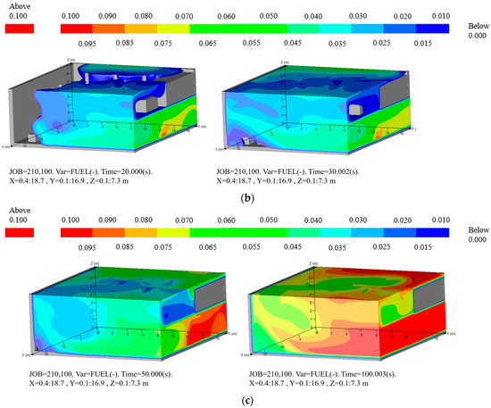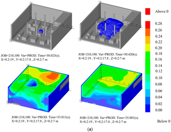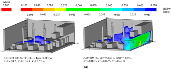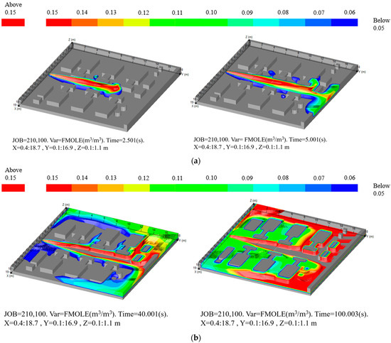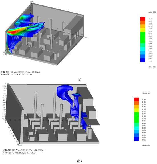 This study selected different leakage points and leakage directions to study the impact of obstacles on leakage diffusion. As shown in Figure 15 below, the leakage points are (13, 1.1, 1.1), (6, 14.5, 1.1), and their leakage directions are +Y and −Y, respectively. It can be observed from the figure that when the ejected gas encounters an obstacle perpendicular to the ejection direction, it will immediately change direction and diffuse along the obstacle wall. As shown in Figure 15, when the jet gas encounters an obstacle, its main ejection direction changes to +Z; that is, it sprays and diffuses toward the upper space of the cabin. It can be concluded that the direction of gas leakage can be controlled by designing the placement of equipment inside the cabin to reduce the hazard.