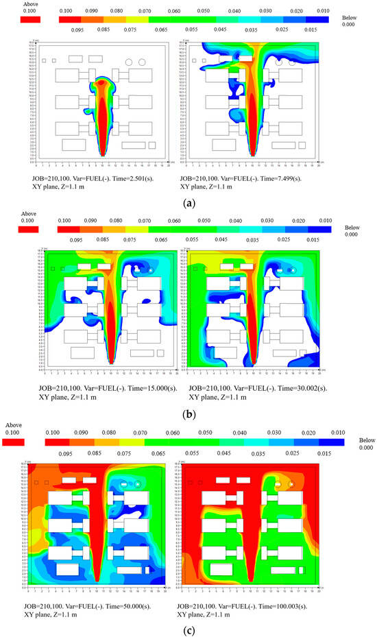To analyze the leakage and dispersion characteristics of LNG in the horizontal direction, the XY cross-section at a height of 1.1 m (the elevation of the leakage source) was monitored to obtain the fuel distribution, as illustrated in Figure 7. From the XY cross-sectional visualization of the gas cloud dispersion process, it is evident that the frontal distribution of LNG dispersion is symmetric about the leakage source along the X-axis. This symmetry primarily arises because, at this stage, the gas cloud dispersion is largely unaffected by external wind speed and obstacles. By analyzing the gas cloud dispersion visualization 8 s after the leakage, low-concentration gas clouds are observed in certain areas of the engine aisle. This phenomenon occurs because, as the leaking gas cloud disperses along the X-axis, a portion of it encounters engine equipment, altering its propagation direction. This results in diversion and dispersion to both sides, with accumulation near the obstacles forming low-concentration gas clouds. Simultaneously, the majority of the gas cloud continues to disperse further along the Y-axis until it encounters the cabin wall. The gas cloud is influenced by obstacles and air resistance, causing the momentum of the jet gas at its front end to decrease sharply. As a result, the gas cloud primarily disperses along the X-axis, with its overall width increasing significantly. From the mid-term gas cloud dispersion distribution diagram, it is evident that the gas cloud disperses toward the corner of the cabin along the far wall of the Y-axis, where it accumulates continuously. It then begins to disperse and propagate along the wall back toward the leakage source, forming an olive-shaped boundary externally. Simultaneously, a reflux zone opposing the jet forms on the side wall of the cabin. This indicates that the LNG leakage in the ship’s engine room can be classified as a turbulent restricted jet. By analyzing the late-stage gas cloud dispersion distribution diagram, it is evident that the gas cloud gradually disperses and fills the entire cabin. At the conclusion of the dispersion simulation, the gas cloud concentration is highest near the far wall of the cabin along the Y-axis and the walls at the left and right ends of the X-axis. Conversely, the concentration near the engine equipment is generally lower, demonstrating that obstacles exert a hindering effect on the propagation of gas clouds.