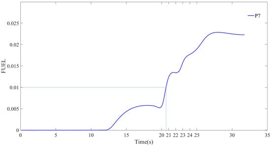 Normally, the LNG supply system in the engine room is equipped with an emergency shutdown system (ESD). ESD is crucial to ship safety and its role is to safely and effectively prevent the leakage and spread of LNG. A monitoring system is installed at leak-prone locations such as LNG pipelines, and an ESD system is installed in the LNG supply system. The system will stop the supply of LNG in an emergency. Once the gas detection system detects that the LNG leaks to a dangerous concentration, the LNG supply will be cut off immediately [34]. Due to the complex layout of LNG pipelines, the location of the leakage point is not fixed, and it is not in line with the actual situation to arrange too many monitoring points inside the cabin. Considering that the density of LNG is less than that of air, LNG usually diffuses upward after leakage. In order to eliminate the influence of different leakage points and leakage directions on detection, this study sets the monitoring point P7 on the ceiling at the center of the cabin. The specific coordinates of the monitoring point P7 are (10, 9, 7.5). The explosion concentration range of LNG is 5.3% to 14.4% [2,3]. Taking into account the distance between the monitoring point and the leakage source, and analogous to the activation conditions of the ESD system in mining engineering, the ESD system is immediately activated when the monitoring point detects a 1% LNG concentration [35]. The gas concentration variation curve detected by the monitoring point P7 is shown in Figure 9. It can be observed in the figure that the LNG concentration detected at the monitoring point reaches 1% at about 20 s, so the ESD system activation time should be 20 s.