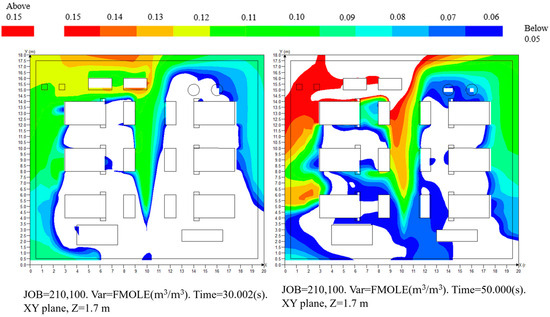 To investigate the explosion process of liquefied natural gas following leakage and dispersion in the ship’s engine room, as well as the propagation characteristics of shock waves, two LNG vapor clouds with varying sizes and concentrations at 30 s and 50 s post leakage were introduced into the explosion model for simulation. To ensure a fixed and effective ignition source position, the distribution of the explosion limit of the leaking gas cloud at a cabin height of 1.7 m was analyzed at 30 s and 50 s of leakage in the XY plane, as illustrated in Figure 10. The ignition source position for this round of explosion simulation is set at (10.1, 9, 1.7).