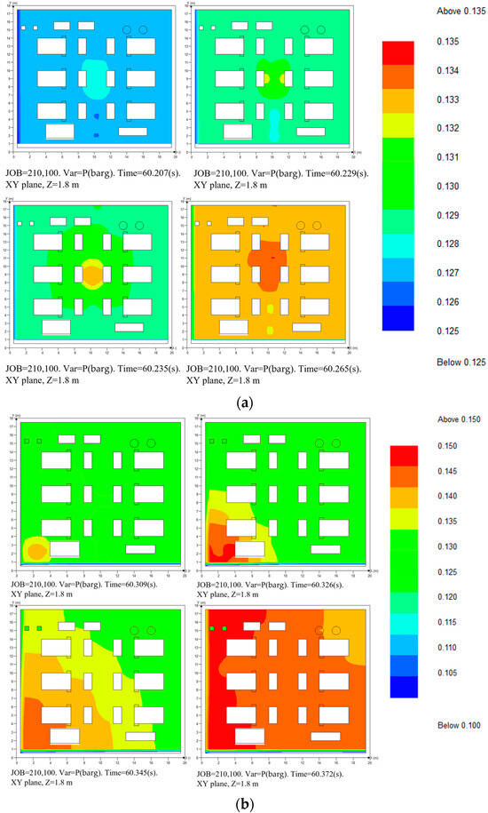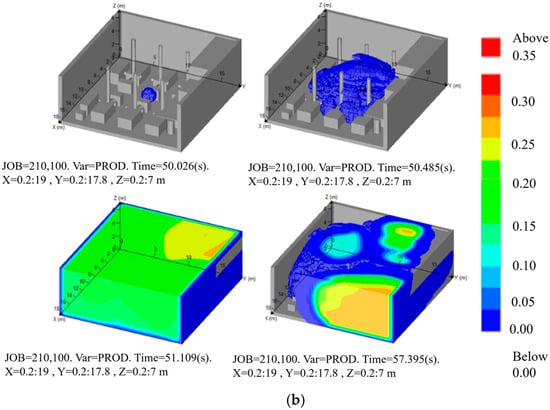 The change of oxygen concentration in the cabin after the explosion: (a) oxygen concentration after the gas cloud exploded 30 s after the leak; (b) oxygen concentration after the gas cloud exploded 50 s after the leak.