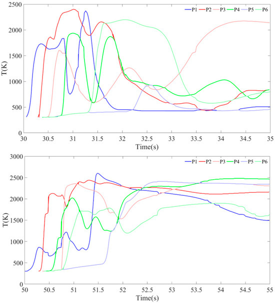 The temperature variation curves for each monitoring point during the ignition and explosion of the gas cloud at 30 s and 50 s post leakage are presented in Figure 12. An analysis of the data reveals that the peak temperatures at each monitoring point are consistent, indicating that the flammable gas cloud is widely distributed throughout the cabin, including its corners, upon ignition. Additionally, the maximum value of the lower curve exceeds that of the upper curve, demonstrating that the intensity of combustion and explosion varies due to differences in ignition time, gas cloud size, and gas cloud concentration. The AISI Type 304 austenitic stainless is generally used as the material for LNG transmission pipeline [36], with a melting point of about 1727 K. The temperature curves for each monitoring point in the table include regions exceeding 1727 K. The high-temperature zones significantly surpass the melting point of the pipeline material, indicating that the explosion will cause substantial damage to the pipeline.