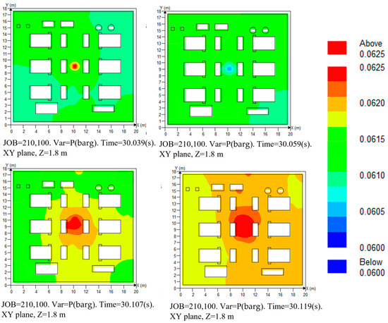 The ignition source is positioned at the center of the vapor cloud (10.1, 9, 1.7) and at the edge of the vapor cloud (2.4, 2.4, 1.7) to conduct two explosion simulations. The pressure distribution of the XY cross-section at a height of 1.8 m for the two explosion simulations is illustrated in Figure 16. When the center of the gas cloud ignites, the explosion shock wave propagates radially outward from the ignition source. Upon encountering obstacles such as cabin equipment, the shock wave accumulates near these obstacles, forming a high-pressure zone. Propagation in this direction is constrained, while the shock wave in other directions continues to push the gas cloud outward, increasing turbulence intensity. When the ignition position is at the edge of the gas cloud, the flame propagates into the unburned region due to the confined state of the gas cloud. Following a period of stable combustion, turbulence within the gas cloud intensifies, leading to an increase in flame propagation speed. Consequently, the unburned region is rapidly and completely ignited. The overpressure value also rises sharply; however, the shock wave energy begins to dissipate during propagation. Reference [30] introduces a uniform gas cloud for explosion simulation, and the pressure field obtained in the open space is a relatively regular shape. In this study, the gas cloud obtained by leakage simulation is used for explosion simulation. It can be observed from Figure 16 that the pressure field of the explosion in the non-uniform gas cloud is relatively irregular, and the pressure field on the obstacle side has an obvious accumulation shape.