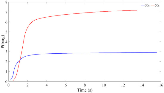The pressure distribution of the XY cross-section at an explosion height of 1.8 m, 30 s post leakage, is illustrated in Figure 13. The pressure variation curves for each monitoring point during the two explosions are presented in Figure 14. Analysis of the data reveals that 0.039 s after ignition, the explosion shock wave propagates outward from the ignition point, creating a high-pressure zone at its center. By 0.059 s post explosion, the pressure difference causes the shock wave to push the combustible gas and combustion products near the ignition source outward, resulting in a low-pressure zone at the center. With the formation of the low-pressure zone, the gas in the space undergoes remixing, triggering a secondary combustion explosion. Subsequently, the shock wave continues to propagate outward. As the walls continuously amplify the turbulence effect, the shock wave reaches the vicinity of the cabin walls, where it cannot dissipate and instead reflects back into the cabin, causing the pressure within the entire cabin to rise further. The pressure–time curves for each monitoring point converge approximately 0.115 s after the explosion. Following the stabilization of the two explosion simulations, the cabin pressure stabilized at 2.8 barg under the 30 s leakage explosion condition and at 6.5 barg under the 50 s leakage explosion condition.