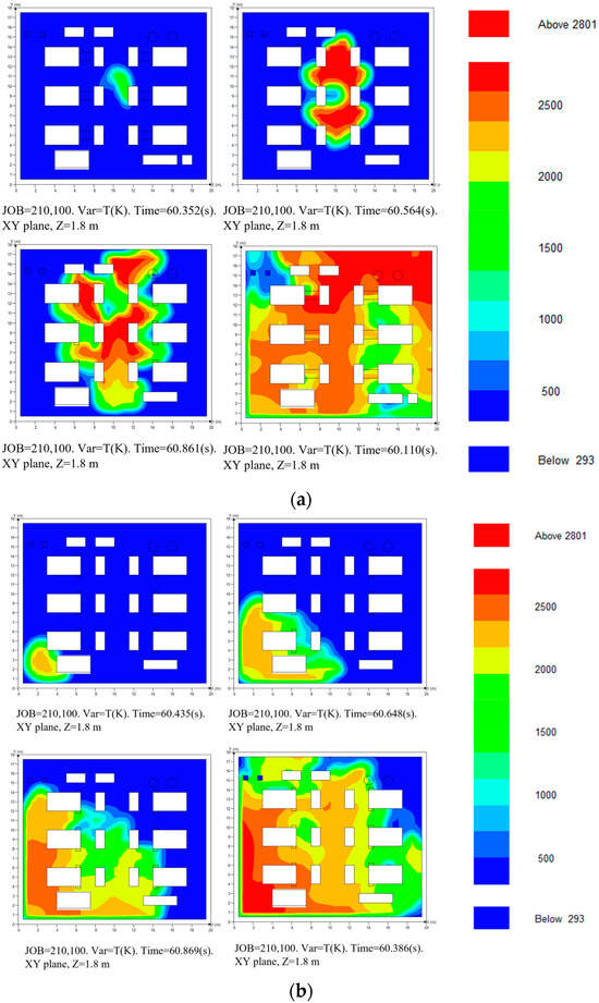 The temperature distribution of the XY cross-section at a height of 1.8 m for the two explosion simulations is illustrated in Figure 17. When ignition occurs at the center or edge of the gas cloud, the temperature at the ignition source rises sharply due to intense chemical reactions and heat release. As the flame propagates into the unburned gas cloud, the temperature in that region gradually increases. Over time, the combustible gas cloud at the combustion center is depleted, and combustion and explosion can no longer be sustained. In these regions, the rate of heat dissipation exceeds the rate of heat generation, causing the temperature to gradually decrease. This results in a blue area within the red zone in the figure. Due to the presence of obstacles such as cabin equipment, heat accumulation is difficult to dissipate, leading to multiple high-temperature (red) zones between the equipment in Figure 17. Figure 18 shows the temperature detection data of six monitoring points under the conditions of center ignition and edge ignition. By observing Figure 18, it can be concluded that the peak temperatures in both cases are similar, both significantly exceeding the melting point of the pipeline steel, posing a great risk of damage to the pipeline. The location of the combustion source within the combustible vapor cloud mainly affects the temperature distribution, but has the least impact on the temperature amplitude.