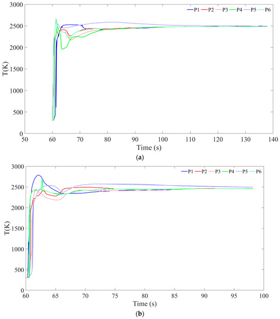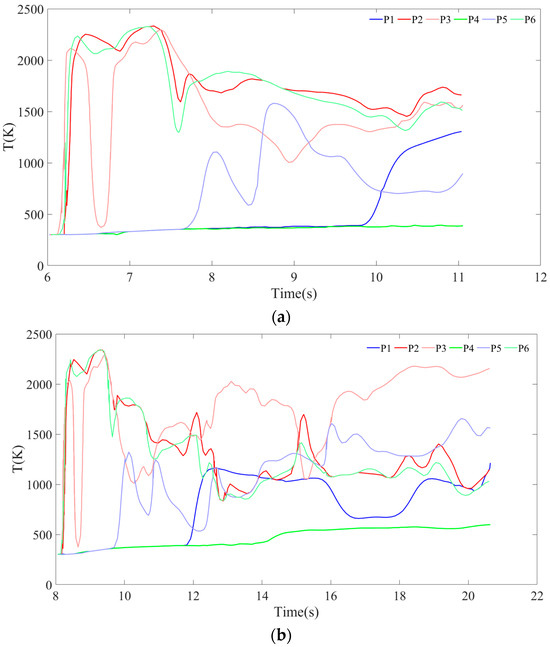 Temperature-change curves of six monitoring points: (a) 6 s leak time; (b) 8 s leak time.