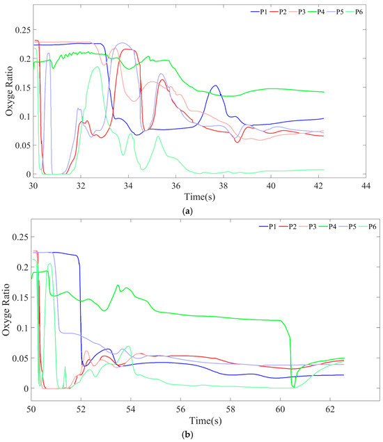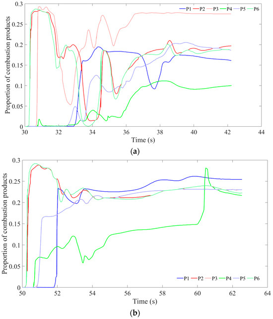 The change in combustion products in the cabin after the explosion: (a) combustion product ratio after gas cloud explosion for 30 s after leakage; (b) combustion product ratio after gas cloud explosion for 50 s after leakage.