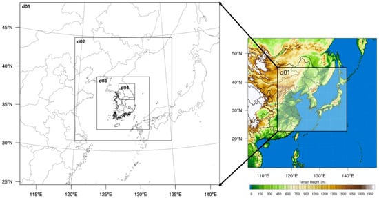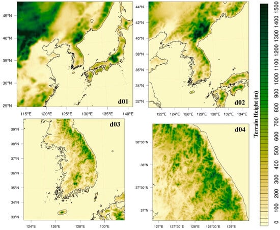 The WRF model version 3.7.1 was used to evaluate the subgrid-scale topographic parameterization and slope and shading parameterizations. The period from 31 March to 1 May 2019 was simulated, and all simulations lasted two days, including spin-up time. The initial and boundary datasets were derived from GDAS FNL with a horizontal resolution of 1° × 1° from the National Centers for Environmental Prediction/National Centers for Atmospheric Research (NCEP/NCAR) and were used at 6 h intervals. There are four domains that are one-way nested. The horizontal resolutions for domains 1 (d01), 2 (d02), 3 (d03), and 4 (d04) were 27 km, 9 km, 3 km, and 1 km, respectively. Figure 1 depicts the domain configurations, and Figure 2 shows the topographical elevation of each domain in the model.