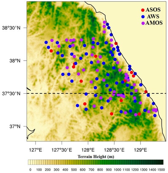 South Korea has the fourth largest forest area ratio in the world, at 62.7%. Gangwon-do includes 21.6% of the total forest area, 6,298,134 ha, accounting for 81.2% of the total provincial area [1]. Gangwon-do, which is the largest forest in South Korea, is divided into the Yeongdong and Yeongseo regions based on the Taebaek Mountains, and these two regions have distinct climates. Due to its location on the leeward side of the Taebaek Mountains, the Yeongdong region frequently has strong and dry downslope winds in spring and autumn [2]. In spring, continental westerly winds bring dry conditions to the mountainous region in Korea. Due to the Korean Peninsula’s geographic location, high pressure to the south and low pressure in the north combine with the regional effect of the Taebaek Mountains, producing a Foehn effect that generates strong, dry winds. This wind generates conditions conducive to wildfires, and when they do occur, they spread rapidly and inflict major damage [3]. Meteorological phenomena in forested areas are regional and irregular, with more complex topography than on flat ground [4,5]. Furthermore, because the spatial density of surface weather stations is low in comparison to that of flatlands, such as a city with a large population [6], determining the exact spatial distribution of meteorological elements is challenging [7,8,9].