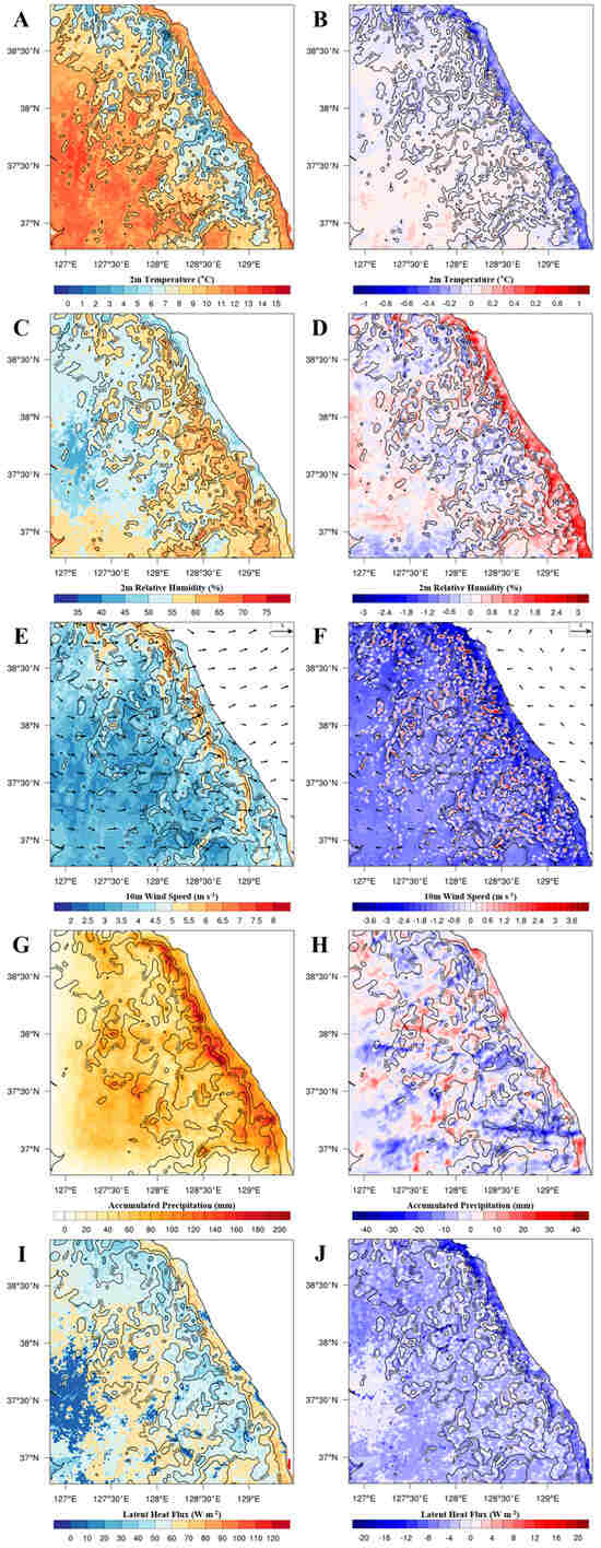 Averaged horizontal distribution (CTL, left) and difference (TOP-CTL, right) of (A,B) 2 m temperature (°C), (C,D) 2 m relative humidity (%), (E,F) 10 m wind speed (m s−1) with wind vector, (G,H) accumulated precipitation (mm), and (I,J) surface latent heat flux (W m−2). The black line represents terrain height at 300 m intervals.