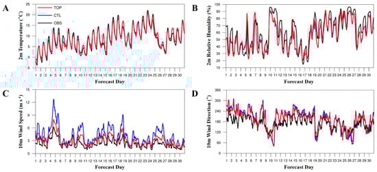 Time series for the observed (black), CTL (blue), and TOP (red) observations of (A) 2 m temperature (°C), (B) 2 m relative humidity (%), (C) 10 m wind speed (m s−1), and (D) 10 m wind direction (°).