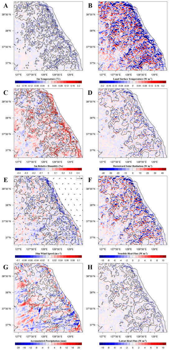 Averaged horizontal difference distribution (SSE-CTL) of (A) 2 m temperature (°C), (B) land surface temperature (°C), (C) 2 m relative humidity (%), (D) downward short wave flux (W m−2), (E) 10 m wind speed (m s−1) with wind vector, (F) sensible heat flux (W m−2), (G) accumulated precipitation (mm), and (H) latent heat flux (W m−2). The solid line represents terrain height expressed in the model at 300 m intervals.