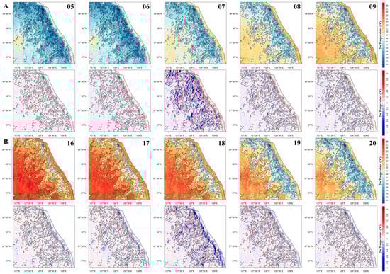 Averaged 2 m temperature (°C) horizontal distribution of the CTL and averaged horizontal distribution difference (SSE-CTL). (A) 0500–0900 LST. (B) 1600–2000 LST.