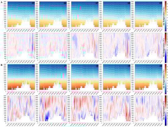 Averaged air temperature (°C) vertical distribution of the CTL and averaged air temperature vertical distribution difference (SSE-CTL) (A) from 0500 to 0900 LST at hourly interval (B) from 1600 to 2000 LST at hourly interval.