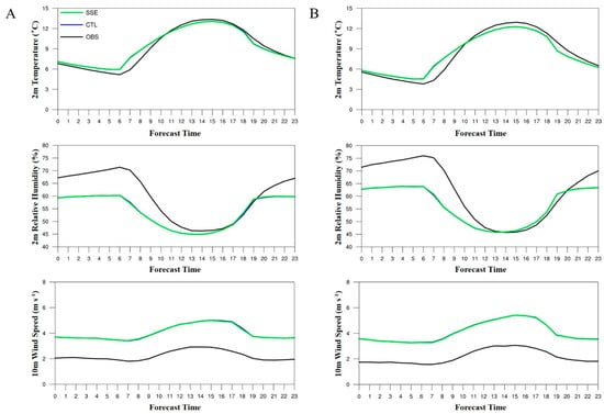 Diurnal cycle of observed and simulated 2 m temperature (°C), 2 m relative humidity (%), and 10 m wind speed (m s−1). (A) Eastward station (45° ≤ A ≤ 135°) and (B) westward station (225° ≤ A ≤ 315°).