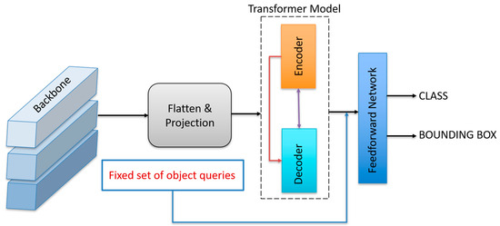 - Decoder: The decoder consists of a fixed set of learnable object queries that interact with the encoder outputs via cross-attention mechanisms. Each query is designed to attend to different spatial regions of the image and predict one object instance.