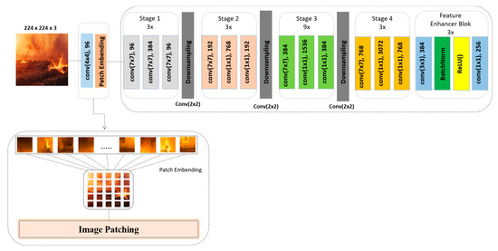 In response to these limitations, recent advancements in artificial intelligence, particularly in computer vision and deep learning [6], have opened new avenues for enhancing early-stage fire detection [7]. Deep learning-based object detection frameworks have shown exceptional capabilities in accurately identifying and localizing objects within complex visual scenarios [8]. Among these, the Detection Transformer (DETR) [9] stands out for its innovative use of transformer architectures [10], introducing a fully end-to-end model [11] that eliminates traditional reliance on handcrafted features and heuristics such as anchor boxes and region proposals [12]. Despite its SOTA design, DETR’s original implementation encounters challenges [13] including slower convergence rates and reduced sensitivity [14] to small-scale visual elements, which are crucial for effective early-stage fire detection [15]. To overcome these limitations, we propose a novel architectural enhancement to the DETR framework, integrating a refined convolutional backbone and a feature enrichment strategy to improve small-scale fire detection. ConvNeXt integrates several modern design principles inspired by vision transformers, resulting in improved performance over traditional convolutional networks, as demonstrated in recent benchmarks. Its enhanced capacity for capturing spatial and contextual features through hierarchical stages and depthwise convolutions makes it uniquely suitable for addressing the fine-grained detection tasks encountered in fire identification. To further improve feature representation, we incorporate an FEB, which is designed to enhance the spatial and contextual quality of the features extracted by the backbone.