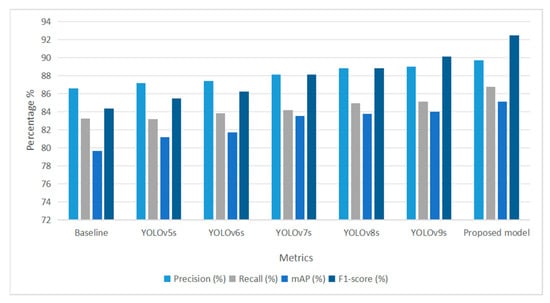 Table 3 provides a comprehensive comparative analysis between the proposed model and several state-of-the-art (SOTA) object detection frameworks, including DETR and various YOLOv-series models ranging from YOLOv5s to YOLOv9s. Table 2 presents a comparative evaluation showing that our proposed model achieves marginally higher performance across all key metrics under the specific experimental setup used. In terms of precision, the proposed model achieves the highest score of 89.67%, outperforming YOLOv9s with 88.96% and YOLOv8s with 88.78%, indicating fewer false positives and a higher degree of confidence in predictions.