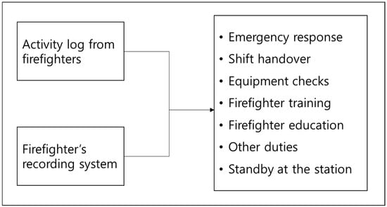 To classify firefighter tasks, firefighters participating in the noise measurements recorded their daily activities and subjectively reported noise characteristics. Owing to the nature of firefighting work involving frequent emergency situations, it was challenging for participants to remember every detail. Thus, the precise classification of tasks was supported by accessing each firefighter’s recording system to obtain accurate dispatch times, return times, number of dispatches, and brief descriptions of the tasks performed (Figure 1).