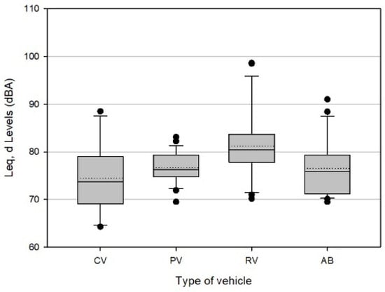 Comparison of adjusted 8 h time-weighted noise levels, Leq,d (dBA), by type of vehicle (ER 3 dB) (CV: Command vehicle; PV: Pump vehicle; RV: Rescue vehicle; AB: Ambulance; Solid line: Mean value).