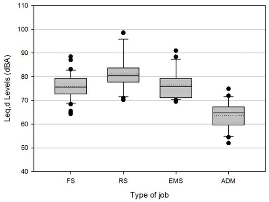 Comparison of adjusted 8 h time-weighted noise levels, Leq,d (dBA), by type of vehicle (ER 3 dB) (FS: Fire suppression; RS: Rescue; EMS: Emergency medical services; ADM: Administration; Solid line: Mean value).