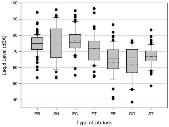 Comparison of adjusted 8 h time-weighted noise levels, Leq,d (dBA), by type of job task (ER 3 dB) (ER: Emergency response; SH: Shift handover; EC: Equipment checks; FT: Firefighter training; FE: Firefighter education; OD: Other duties; ST: Standby at the station; Solid line: Mean value).