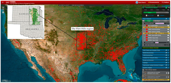 Prescribed fire is a long-established land management practice in the Flint Hills region (Figure 2), which includes most of eastern Kansas and northern Oklahoma. On average, approximately 0.8 million hectares are intentionally burned in the region each year, with most prescribed fires occurring during April. To quantify prescribed fire activities, we used a remotely sensed burned area dataset derived from the Moderate-Resolution Imaging Spectroradiometer (MODIS) onboard National Aeronautics and Space Administration (NASA)’s Terra and Aqua satellites [16]. This dataset, which covers the 17 Flint Hill counties from 2003 to 2019, was generated using a supervised minimum distance classification of bi-spectral MODIS imagery. MODIS on these satellites is making daily observations of the Earth with 36 channels spanning the spectral range from 0.41 to 15 µm and representing three spatial resolutions: 250 m (2 channels), 500 m (5 channels), and 1 km (29 channels) [21]. A combination of band 1 red (620–670 nm) and band 2 near-infrared (841–876 nm) at a spatial resolution of 250 m was used in our study because it offers the optimal combination of spatial, temporal, and spectral properties for this application. The MODIS-based daily burned area captures both prescribed and unplanned fire events across the region. For our analysis, we integrated this dataset with reported wildfire burned area data in the Flint Hills region to enable the comparative assessments of prescribed fires and wildfires.