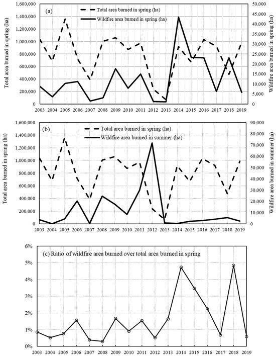 The comparison of the total area burned and the wildfire area burned in the Flint Hills region (2003–2019). (a) Total area burned in spring vs. wildfire area burned in spring; (b) Total area burned in spring vs. wildfire area burned in summer; (c) Ratio of wildfire area burned over total area burned in spring.
