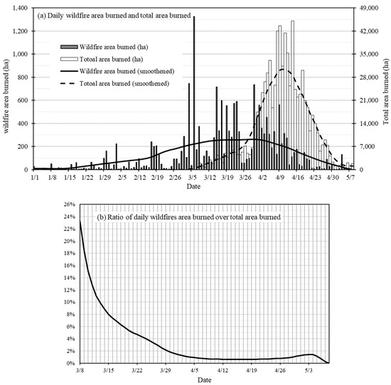 (a) Multi-year average daily wildfire area burned and total area burned on different dates in the Flint Hills region. (b) The ratio of multi-year average daily wildfire area burned (smoothened data) over total area burned (smoothened data) on different dates.