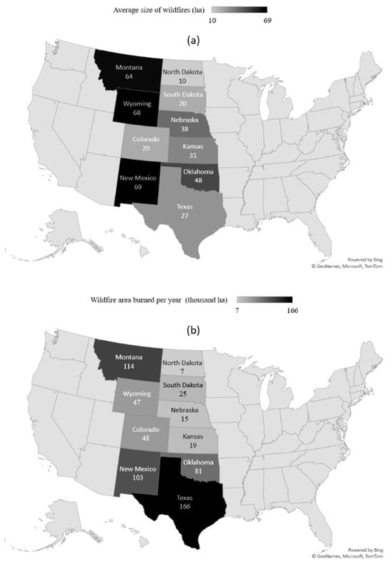 This study analyzed the historical wildfire data from 1992 to 2020 to characterize wildfire risk across the Great Plains. The results show that wildfire frequency generally increases from north to south, likely driven by increasing temperature, while average wildfire size increases from east to west due to differences in dominant land cover types. The average wildfire size per burn was notably larger in Montana, Wyoming, and New Mexico (Figure 8a). This pattern is likely due to the greater prevalence of woody vegetation in these mountainous western states, which is more conducive to extreme wildfire behavior compared to other land-use types in the region [28]. The distribution of land-use types in the Great Plains is described in Donovan et al. [28]. As also reported by Scasta et al. [29], wildfire frequency generally increases from north to south, driven by rising temperatures. Texas, in particular, exhibits the highest wildfire frequency. As a result, both the western and southern Great Plains states tend to have larger annual burned areas (Figure 8b).